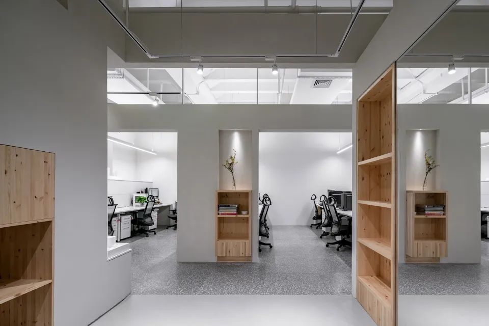 這是一個“解構”的新型辦公室。與傳統的辦公場所不一樣,這里強調的是開放中又有私密,互動和獨立相容。從整體來看,這是一個風格較為硬朗粗獷的空間,我們融入了“微工業風”的元素,但墻體一白色覆蓋,則彰顯出柔和與想象空間。